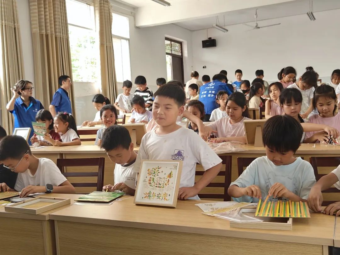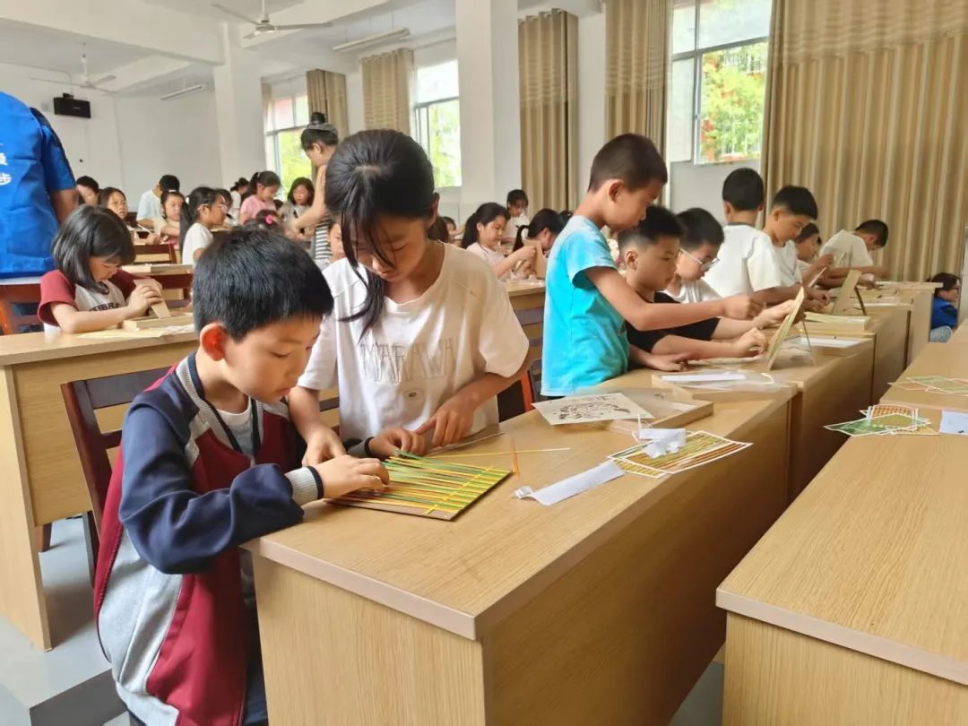 活动的核心环节——端午竹编画手工制作,在志愿者细致引导下,孩子们化身小小“非遗传承人”,灵巧手指穿梭于竹篾之间,全神贯注地编织着龙舟、粽叶等端午意象。篾条交错,图案渐显,传统技艺在稚嫩指尖焕发新生。这不仅是手工课堂,更是对千年端午文化的沉浸式触摸,让家国情怀如竹编纹路般深深烙印在童心深处。