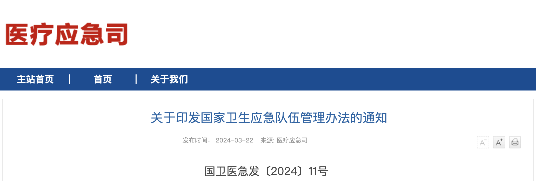 日前国家卫健委、国家中医药局、国家疾控局组织制定了第一条 为加强和规范国家卫生应急队伍建设与管理,全面提升国家卫生应急队伍的应急处置能力和水平,依据《中华人民共和国突发事件应对法》《突发公共卫生事件应急条例》等法律法规,以及《国家突发公共卫生事件应急预案》《国家突发公共事件医疗卫生救援应急预案》等预案,制定本办法。第二条 本办法所称国家卫生应急队伍(含国家卫生应急移动处置中心),是指由国务院卫生健康行政部门(国务院中医药主管部门、国务院疾控主管部门)建设与管理,参与特别重大及其他需要响应的突发事件现场卫生应急处置的专业医疗卫生救援队伍。国家卫生应急队伍主要分为紧急医学救援类、重大疫情医疗应急类、突发中毒事件处置类、核和辐射突发事件卫生应急类(上述4类队伍由国务院卫生健康行政部门负责建设管理)、中医应急医疗类(国务院中医药主管部门负责建设管理)、突发急性传染病防控类(国务院疾控主管部门负责建设管理)。国家卫生应急队伍成员(以下简称队员)来自医疗卫生等机构,平时承担所在单位日常工作,应急时承担卫生应急处置任务。第三条 省级、地市级和县级卫生健康行政部门(中医药主管部门、疾控主管部门)要根据突发事件风险评估,加强地方卫生应急队伍建设,原则上所有医疗卫生机构均应具备卫生应急处置能力,形成完善的卫生应急队伍体系。第四条 卫生应急队伍建设与管理坚持以习近平新时代中国特色社会主义思想为指导,全面贯彻党中央、国务院的决策部署;坚持“人民至上、生命至上”,始终把人民群众生命安全放在首位;按照“统一指挥、纪律严明,反应迅速、处置高效,平战结合、布局合理,立足国内、面向国际”的原则,根据地域和突发事件等特点,统筹建设和管理卫生应急队伍。各地要强化队伍指挥调度、组织协同,开展实战化训练演练,注重提高信息化、智能化水平,着力提升队伍突发事件应对能力和社会参与程度。第五条 卫生应急队伍要贯彻“以健康为中心”的原则,加强医防协同,强化公共卫生人员配备,完善医防协同机制,加强突发公共卫生事件研判评估、流行病学调查和溯源等培训,有效减少突发公共卫生事件发生和传播,保障公共卫生安全。第六条 本办法适用于国家卫生应急队伍的建设和管理(突发急性传染病防控类队伍管理办法由国务院疾控主管部门另行制定,以下所称国家卫生应急队伍均不含突发急性传染病防控类队伍)。地方各级卫生健康行政部门(中医药主管部门)参照本办法制定本级卫生应急队伍管理办法或规定。第七条 国务院卫生健康行政部门(国务院中医药主管部门)负责国家卫生应急队伍的总体规划、建设和管理,并委托省级卫生健康行政部门和中医药主管部门(以下简称委托建设单位)具体承担国家卫生应急队伍组建和管理工作;国家卫生应急队伍所在单位(以下简称承建单位)具体承担国家卫生应急队伍的组建和日常管理工作。紧急医学救援类、重大疫情医疗应急类、中医应急医疗类国家卫生应急队伍承建单位须为三级甲等医院,国家医学中心、国家区域医疗中心和国家临床重点专科所在单位优先。国家卫生应急队伍由国务院卫生健康行政部门(国务院中医药主管部门)负责组织评估确认,符合国家卫生应急队伍条件的,承担国家卫生应急任务并履行相应职责。第八条 国家卫生应急队伍主要由卫生应急管理人员、医疗卫生专业人员、技术保障和后勤保障人员构成。应急管理和医疗卫生专业人员每队30人以上,设队长1名,副队长2~3名,每支队伍配30人以上的后备人员(国家卫生应急队伍人员构成要求见附件1)。(一)政治坚定过硬,热爱卫生应急事业,忠实履行职责和义务;具有奉献、敬业、团队合作精神;(四)接受过卫生应急培训或参与过突发事件卫生应急处置工作者优先考虑。第十条 队员的遴选按照本人自愿申请,承建单位推荐,委托建设单位审定,报国务院卫生健康行政部门(国务院中医药主管部门)备案的程序进行(队员审批表见附件2)。对于超龄(大于60周岁)或者身体状况不满足应急救援任务的队员应准予退出队伍,承建单位报告委托建设单位核准终止任用,并报国务院卫生健康行政部门(国务院中医药主管部门)备案。 第十一条 队伍应加强装备建设和各项应急预案、标准操作指南制定,队伍功能应满足以下最低标准:紧急医学救援类:每天能开展20台损伤控制手术,每天能接诊200名急诊和门诊患者,开设20张留观病床,重点加强创伤处理能力;实现14天自我保障。重大疫情医疗应急类:每天能完成1000人次以上的实验室检测,每天能接诊200名门诊患者,具备5例以上重症传染性疾病患者的紧急处置能力;具备隔离转运能力和流行病学调查能力;能实现10天自我保障。突发中毒事件处置类:能够开展现场流行病学调查、应急监测与风险评估、毒物采样与快速检测、中毒救治指导、健康监护等,实现7天自我保障。核和辐射突发事件卫生应急类:能够开展伤员体表放射性污染检测、局部和全身去污洗消、内外照射患者剂量估算和医学救治、食品和饮用水放射性监测、健康教育和现场心理救援等,实现7天自我保障。中医应急医疗类:具备传染病检测、应急处置和转运能力,每天能接收200名门诊和急诊患者,可开展损伤控制手术3~5台,重点开展突发事