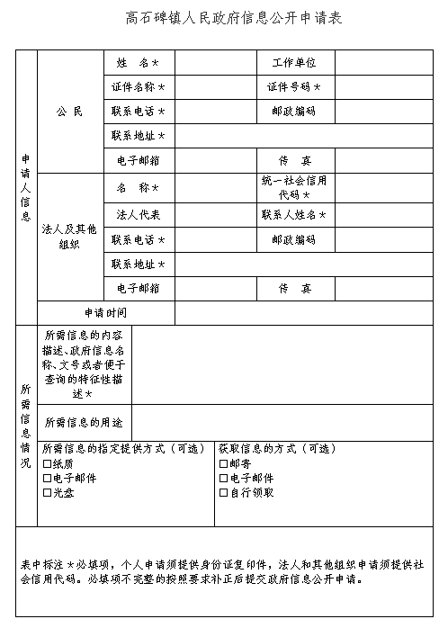 3.互联网申请:申请人可以在高石碑镇人民政府网站“信息公开”专栏“依申请公开”页面,下载《高石碑镇人民政府信息公开申请表》,根据要求填写后通过电子邮件发送;