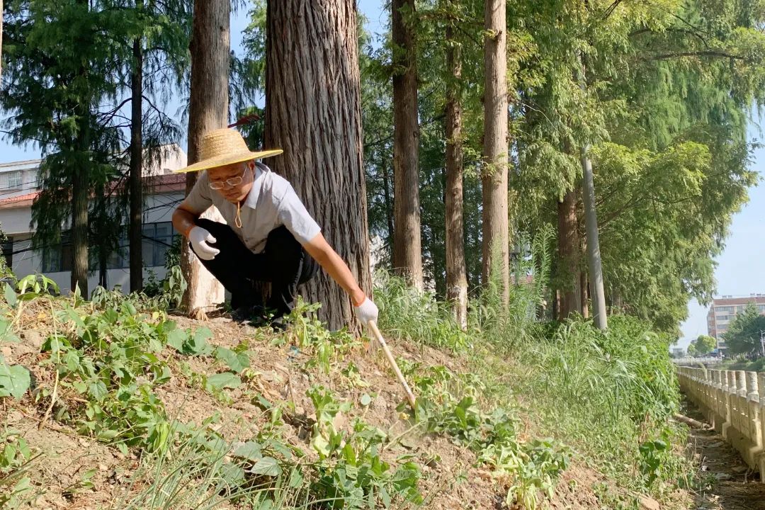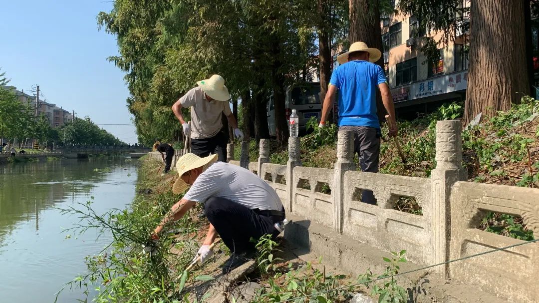 管理区党委委员、副主任单士杰带领党员干部群众清理河道护坡杂草