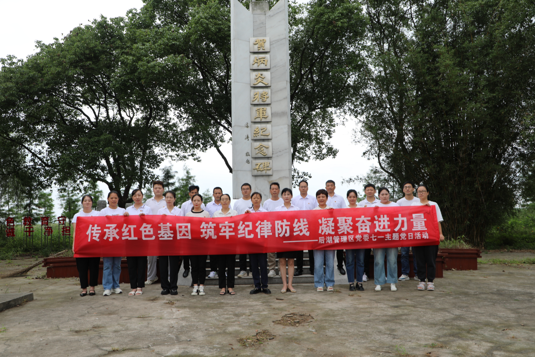 管理区党委以“传承红色基因 筑牢纪律防线 凝聚奋进力量”为主题,组织青年党员及部分纪检委员赴返湾湖贺炳炎纪念碑,聆听英雄事迹,引导青年党员干部牢记初心使命,传承红色基因,共同迎接“七一”到来。