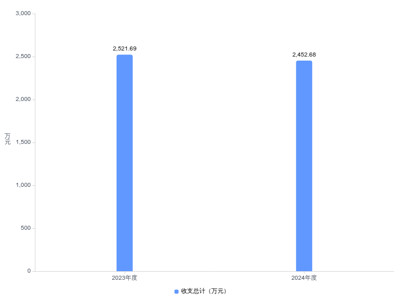 2024年度收、支总计均为2452.68万元。与2023年度相比,收、支总计减少69.01万元,下降2.8%,主要原因是一般公共预算收入降低。