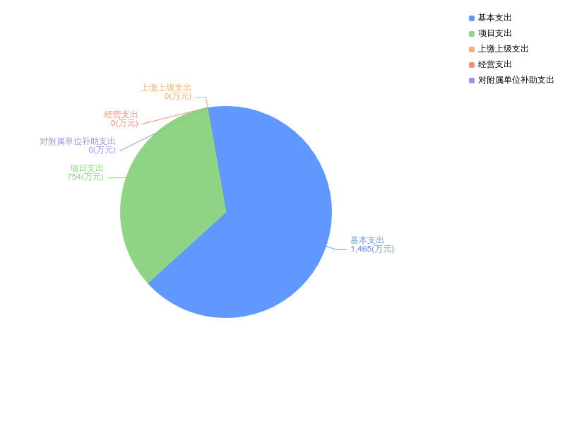 2024年度支出合计2219.32万元,与2023年度相比,收、支总计减少69.01万元,下降2.8%。其中:基本支出1465.43万元,占本年支出66.0%;项目支出753.89万元,占本年支出34.0%;上缴上级支出0.00万元,占本年支出0.0%;经营支出0.00万元,占本年支出0.0%;对附属单位补助支出0.00万元,占本年支出0.0%。