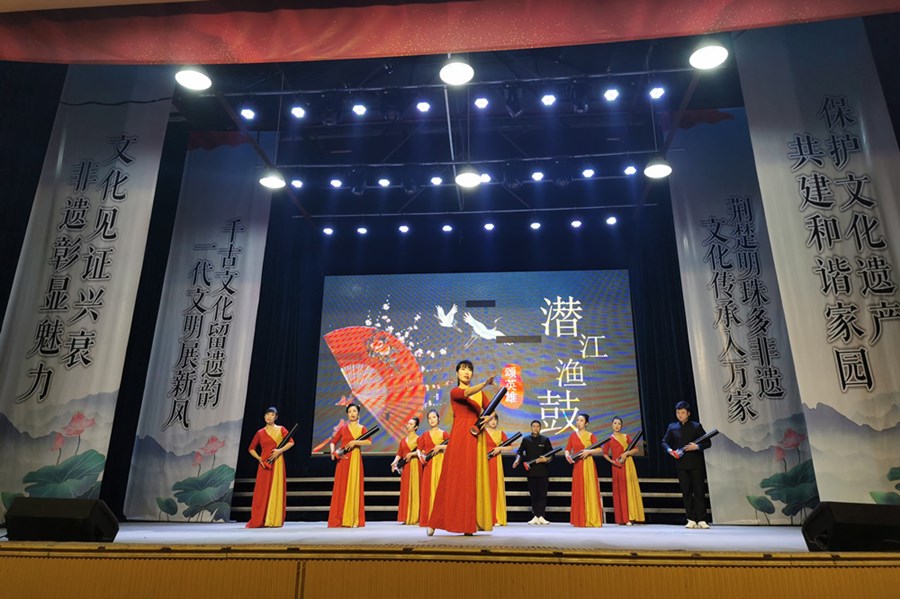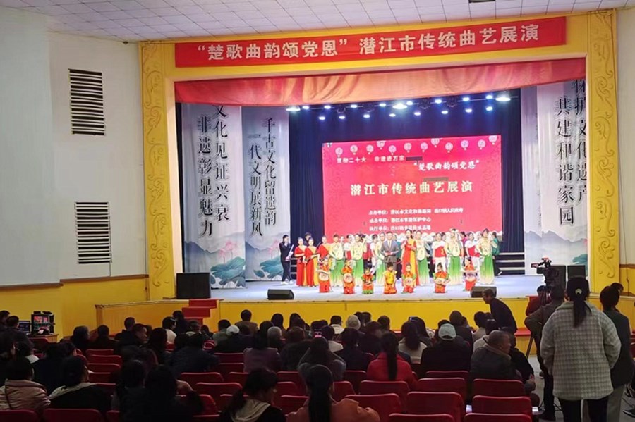 11月16日,“楚歌曲韵颂党恩”潜江传统曲艺展演在浩口镇上演。活动由市文化和旅游局、浩口镇人民政府主办,市非遗保护中心、浩口镇新时代文明实践所承办,旨在认真贯彻党的二十大精神,增强文化自信,共享文化成果。