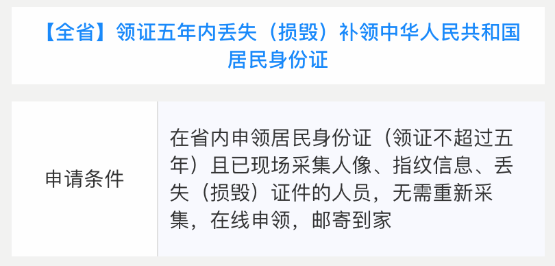 现在,为提升群众办事的便利性,事项优化再升级,对于申领居民身份证不超过【五年】的群众,丢失(损毁)身份证后均可进行线上补领!