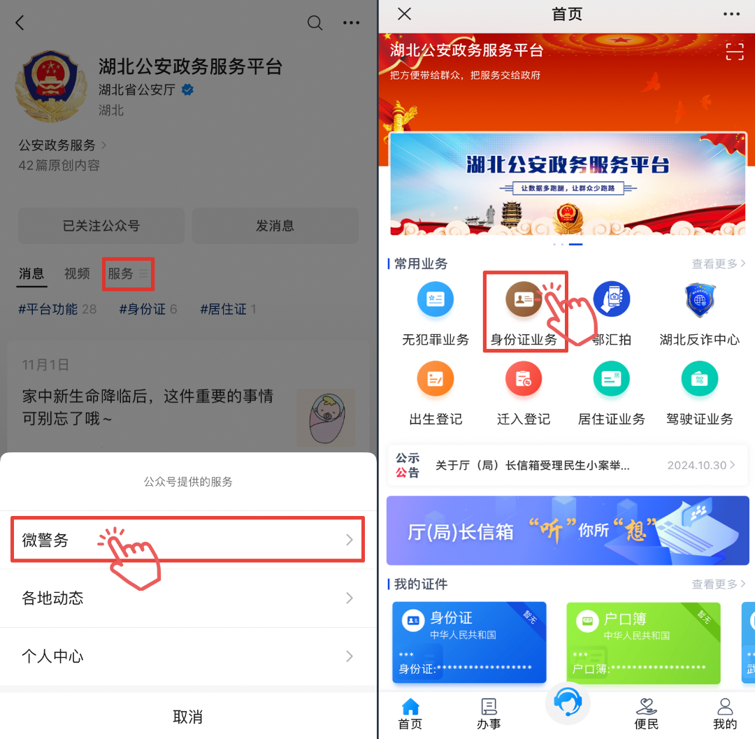 ● 通过公众号“服务”菜单,点击“微警务”,进入湖北公安政务服务平台。