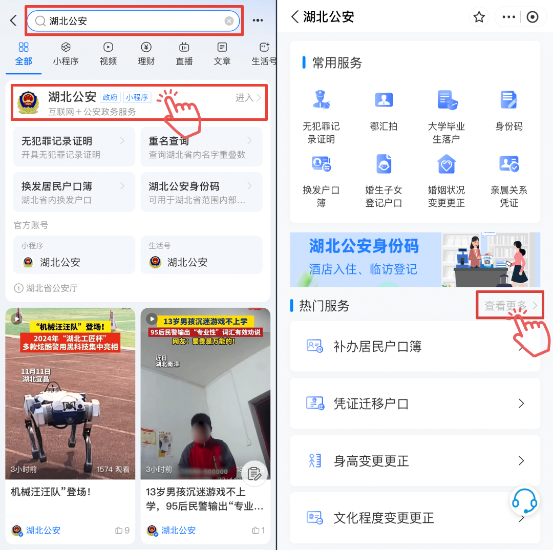 ● 进入支付宝“湖北公安”小程序,点击首页“查看更多”,即可在“户政”部分找到这一事项。