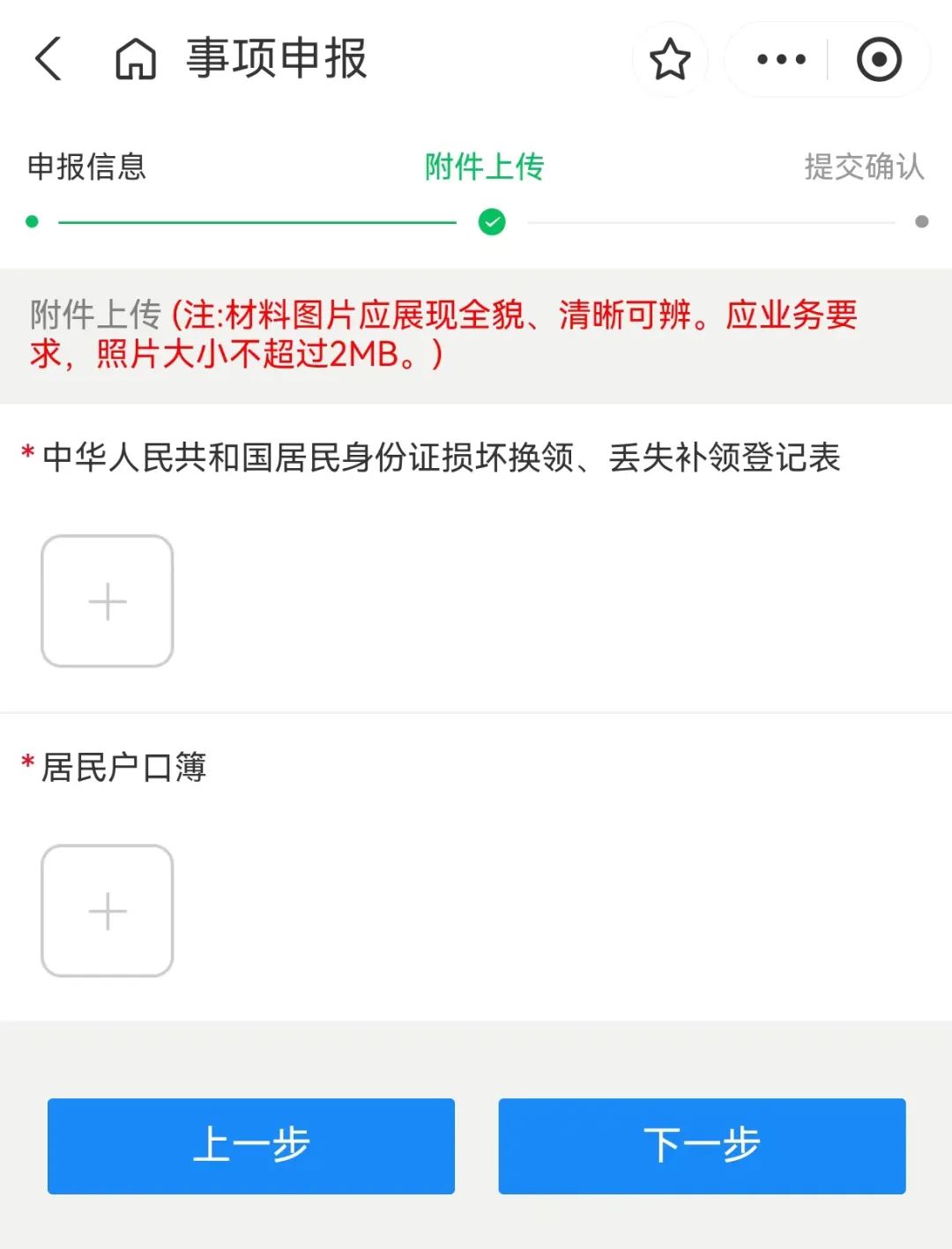 上传已准备好的申报材料,表格需要打印后手写信息再拍照上传,确认后点击“下一步”。