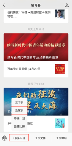 第一步:关注“创青春”公众号选择“服务平台”-“返家乡”栏目。