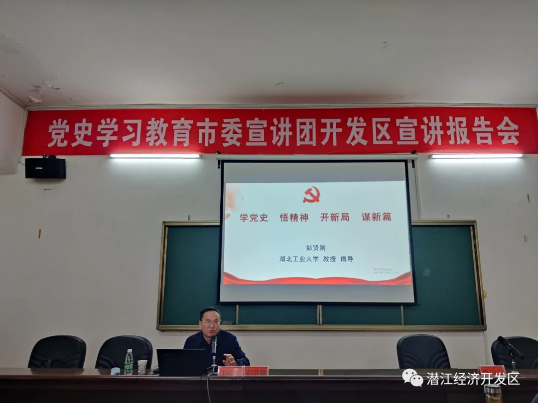 4月26日,潜江经济开发区举办党史学习教育专题宣讲会。湖北工业大学马克思主义学院副院长、教授彭贤则作专题报告,区全体机关干部以及各村(社区)党支部书记共70余人参加。
