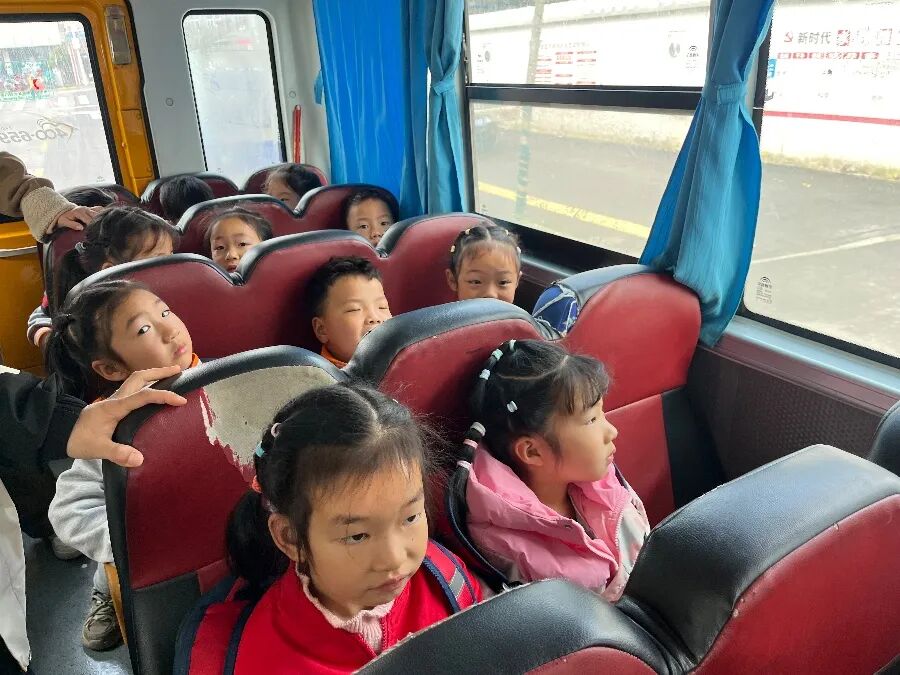 演练开始,小朋友按照日常坐校车的实际情况进行了演练:有序排队上校车→系好安全带→清点人数→校车启动出发。