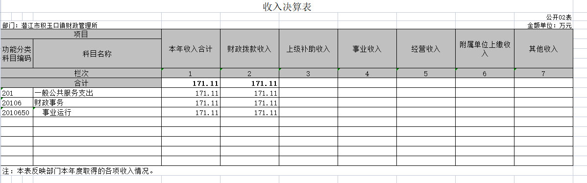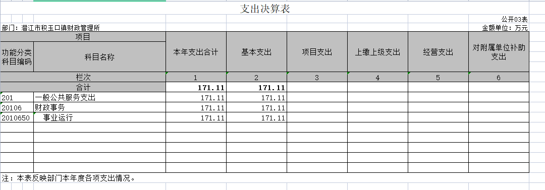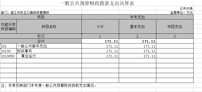 1.一般公共服务支出(类)。年初预算为171.11万元,支出决算为171.11万元,完成年初预算的100%,支出决算数小于年初预算数(凡是年中有追加预算的或决算数低于年初预算数95%的应作原因说明)的主要原因:缩减开支。