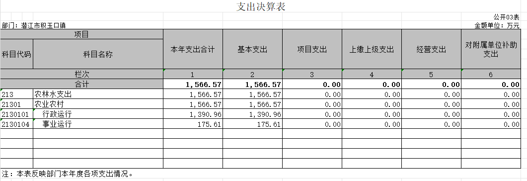 2022年度支出合计1566.57万元。其中:基本支出1566.57万元,占本年支出100%;项目支出0万元,占本年支出0%;上缴上级支出0万元,占本年支出0%;经营支出0万元,占本年支出0%。本部门使用科目:一般公共服务支出-财政事务-事业运行、农林水支出-农业农村-行政运行。其中,政府2022年度支出合计1390.96万元。其中:基本支出1390.96万元,占本年支出100%;项目支出0万元,占本年支出0%;上缴上级支出0万元,占本年支出0%;经营支出0万元,占本年支出0%。本部门使用科目:农林水支出-农业农村-行政运行。财政2022年度支出合计175.61万元。其中:基本支出175.61万元,占本年支出100%;项目支出0万元,占本年支出0%;上缴上级支出0万元,占本年支出0%;经营支出0万元,占本年支出0%。本部门使用科目:一般公共服务支出-财政事务-事业运行。