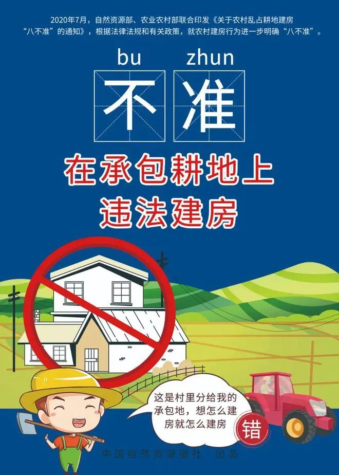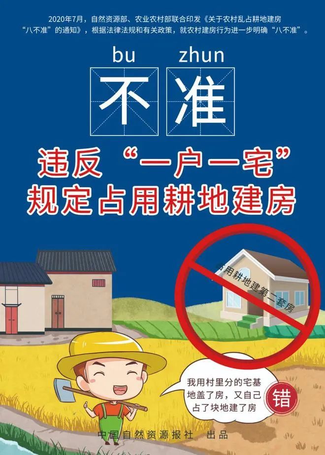 2020年7月底,自然资源部、农业农村部印发《关于农村乱占耕地建房“八不准”的通知》(自然资发〔2020〕127号),提出农村乱占耕地建房“八不准”: