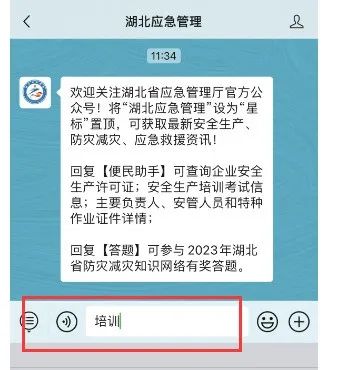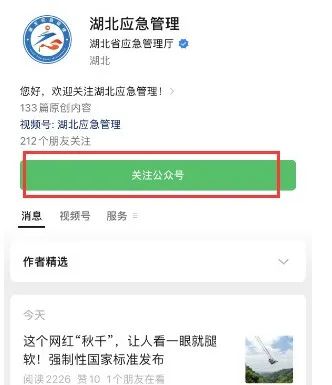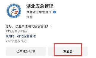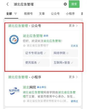 打开微信,在搜索栏输入“湖北应急管理”,点击关注公众号,如下所示: