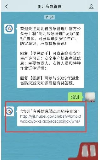 点击对话框按钮,发送“培训”两个字,系统会推送培训有关信息链接,如下所示:
