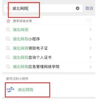 打开微信,搜索栏输入“湖北网院”,点击进入对应小程序。