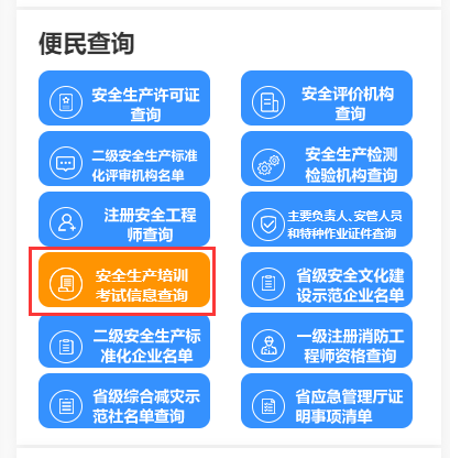 下滑主页面,找到“便民查询”下的“安全生产培训考试信息查询”。