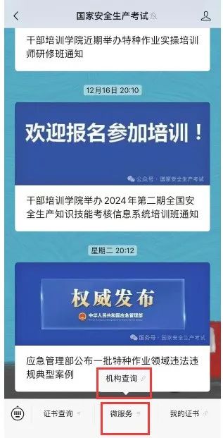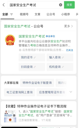 打开微信,在搜索栏输入“国家安全生产考试”进行公众号搜索,搜索完成后,点击对应公众号进行关注,如下所示: