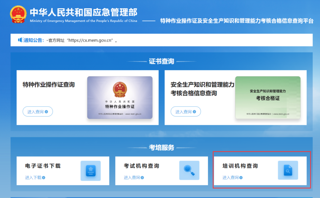 打开电脑,搜索“中华人民共和国应急管理部”,或输入“https://cx.mem.gov.cn”进入应急部官网信息查询界面,点击页面下方“培训机构查询”,即可进入培训机构信息查询页面,如下: