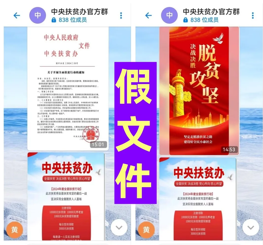 居民吴某收到一个陌生快递,打开后看到里面是一份红头文件《国务院扶贫开发领导小组关于2024全面落实全面脱贫的通知》。文件里显示,凡是收到此文书,就可以领取338万元的“扶贫资金”。吴某觉得红头文件不会骗人,根据提示扫描了文件中的二维码,下载了一款名为“同舟行”的手机软件,并被拉进群聊。群主称,所有群成员每人需要购买610克金条投入国库才能领取“扶贫资金”,并发送了邮寄地址。吴某按照群主指示购买了价值37.6万元的黄金邮寄到指定地址后,对方又称需要继续邮寄黄金才能领取。这时吴某才发现自己被骗。