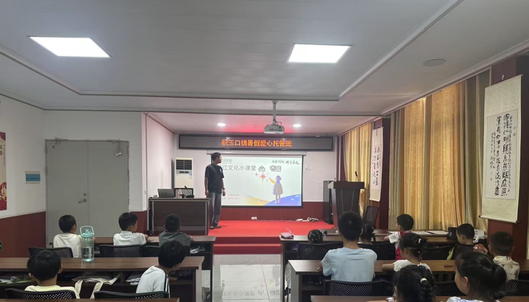 团队负责宣讲的成员屈安鑫登台主讲,开启了“潜江文化小课堂”的第一步,不同于传统授课的枯燥说教,他用趣味互动为引子,从潜江的历史溯源到当地的独特民俗,通过环环相扣的提问,小朋友们的目光逐渐明亮而专注,在课堂问答间带领着小朋友们逐步踏入潜江文化世界中。