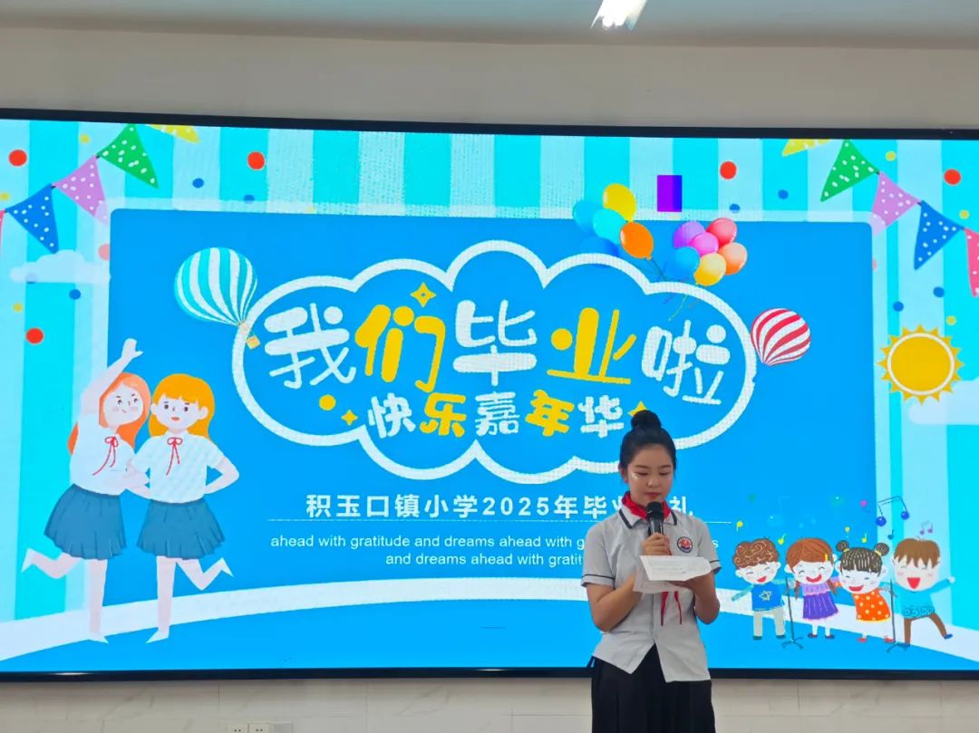 学生代表张涵玉以清越的嗓音讲述自己的成长心迹,感谢老师的孜孜教导,感恩积玉口镇小学,不仅让我们收获知识,还学会了团结、责任与关爱,发言尾声深深鞠躬,额发轻扫过胸前徽章,荡开经久不息的掌声。
