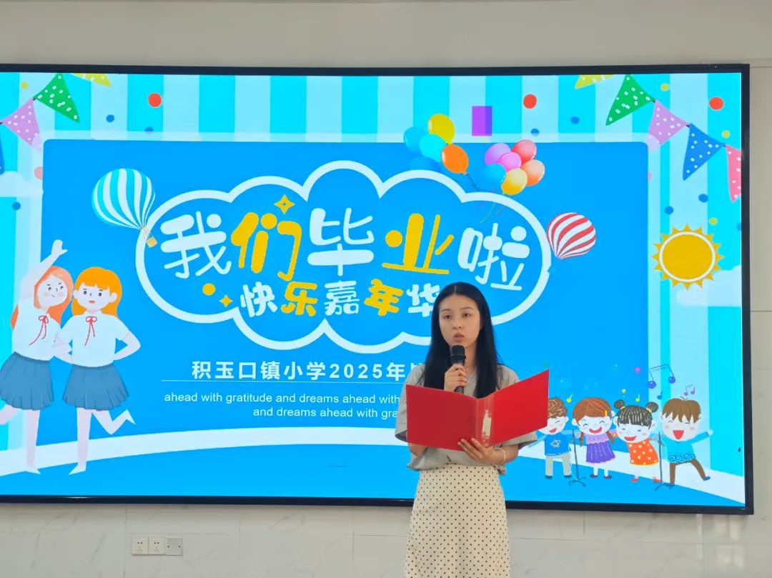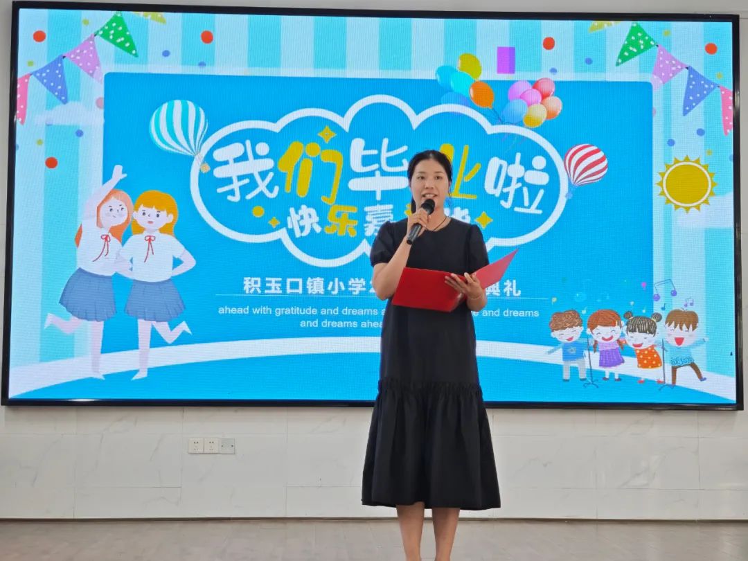 积玉口镇小学政教处主任丁家颖致辞。她首先向同学们表示热烈的祝贺!向为孩子倾注心血和智慧的全体老师表示最衷心的感谢!鼓励少年们,踏出最铿锵的步伐,走向最灿烂的未来。