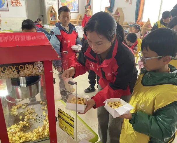 最令人期待的炸爆米花环节将活动氛围推向顶峰。随着锅里的玉米粒在高温下逐渐爆开,“噼啪”声此起彼伏,香甜的气息瞬间弥漫开来。孩子们目不转睛地盯着锅具,不时发出阵阵惊喜欢呼。捧着热乎乎、甜滋滋的爆米花,孩子们你一口我一口分享着,甜蜜的滋味在舌尖蔓延,幸福的笑容在脸上绽放。