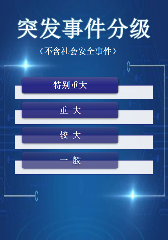 《中华人民共和国突发事件应对法》规定,按照社会危害程度、影响范围等因素,自然灾害、事故灾难、公共卫生事件分为特别重大、重大、较大和一般四级。
