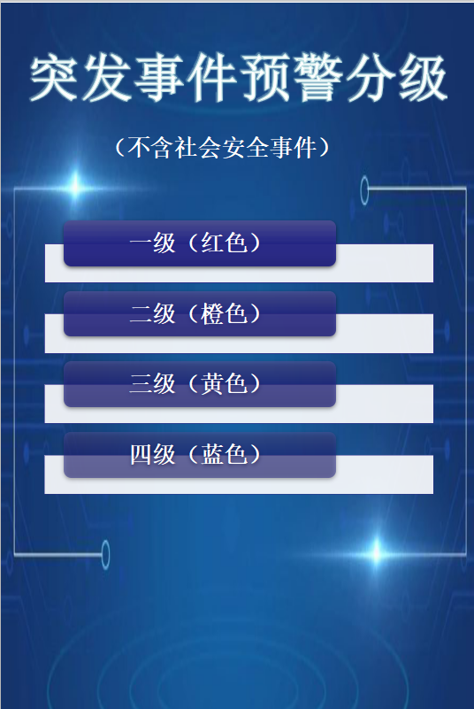 蓝色等级(Ⅳ级):预计将要发生一般(Ⅳ级)以上突发事件,事件即将临近,事态可能会扩大。