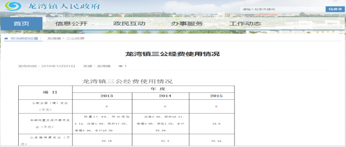 龙湾镇公开2013-2015年公款出国(境)支出(万元)、车辆购置及运行费用支出(万元)、公务接待费支出(万元)三项的支出情况,增加了信息公开的力度。