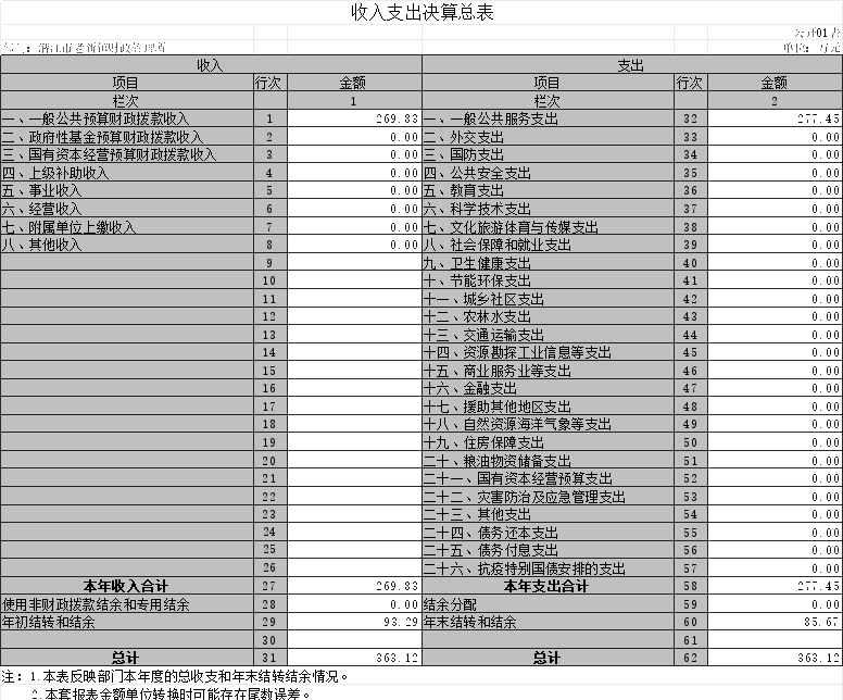 财政2023年度收、支总计均为363.12万元。与2022年度相比,收、支总计减少7.35万元,减少2%,主要原因是本年度相比上年有一名职工调走。