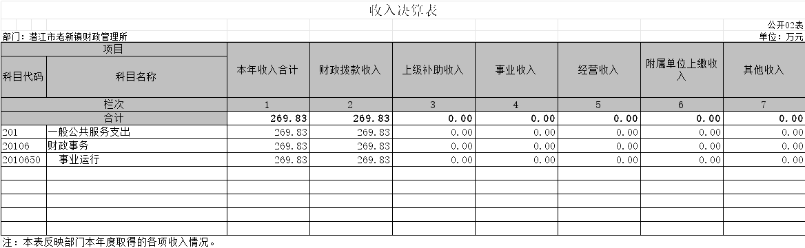 财政2023年度收入合计269.83万元,与2022年度相比,收入合计增加12.99万元,增长5%。其中:财政拨款收入269.83万元,占本年收入100%;上级补助收入0万元,占本年收入0%;事业收入0万元,占本年收入0%;经营收入0万元,占本年收入0%;附属单位上缴收入0万元,占本年收入0%;其他收入0万元,占本年收入0%。