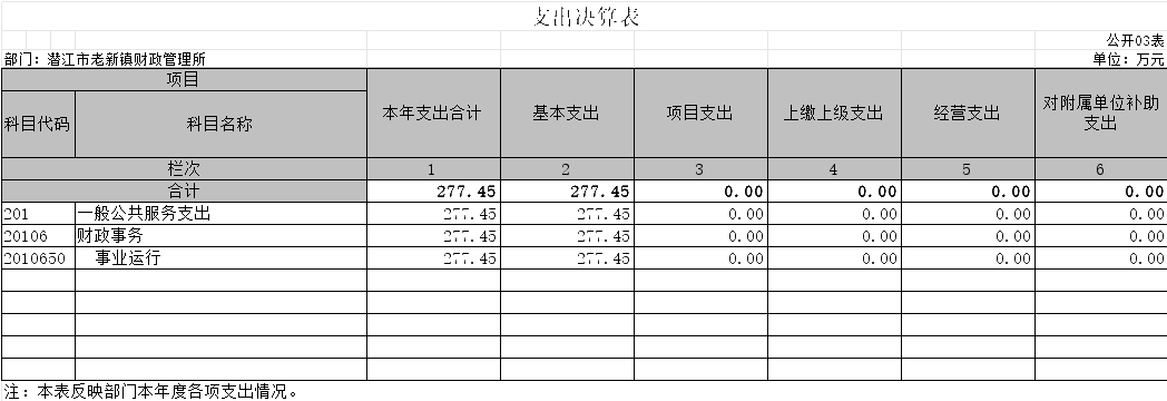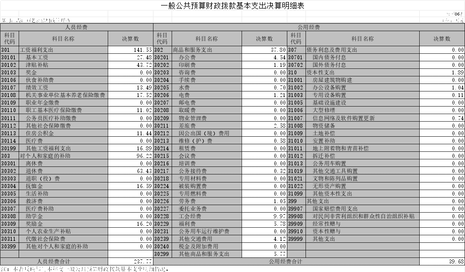 财政2023年度支出合计277.45万元,与2022年度相比,支出合计增加0.27万元,增长0.01%。其中:基本支出277.45万元,占本年支出100%;项目支出0万元,占本年支出0%;上缴上级支出0万元,占本年支出0%;经营支出0万元,占本年支出0%;对附属单位补助支出0万元,占本年支出0%。