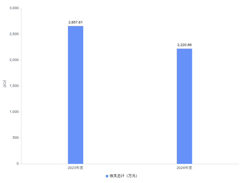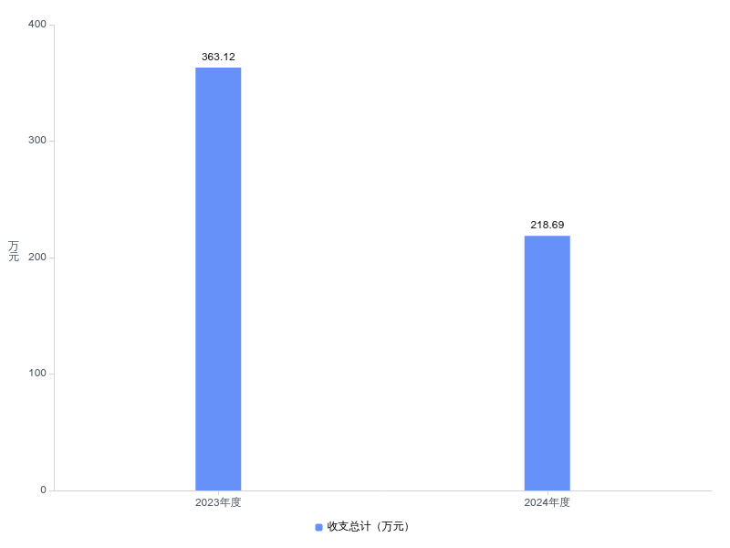 2024年度收、支总计均为218.69万元。与2023年度相比,收、支总计减少144.43万元,下降39.8%,主要原因是2023年度一次性发放2020-2023年度退休人员统筹待遇,2024年度本单位有一名职工退休,人员支出减少。