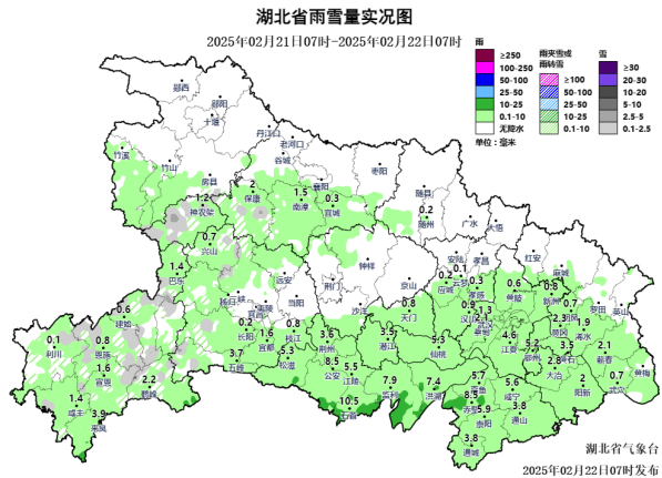 昨日07时至今日07时,我省大部分地区出小雨,南部局地中雨,鄂西高山地区和咸宁九宫山出现降雪,最高气温7~13℃,最低气温2~6℃。