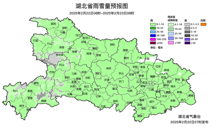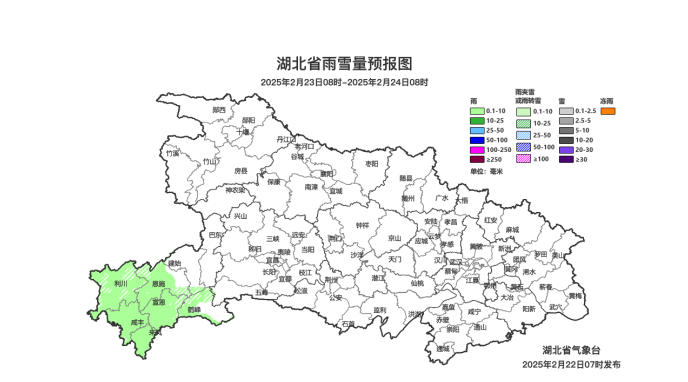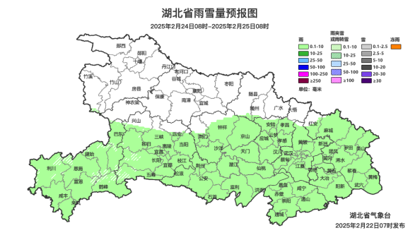 2月24日08时-25日08时,鄂西南阴天有小雨,高山地区有雨夹雪;江汉平原南部、鄂东北、鄂东南阴天,晚上转小雨;其他地区阴天。最高气温西部6~8℃、东部8~12℃,最低气温1~5℃,偏北风2到3级。