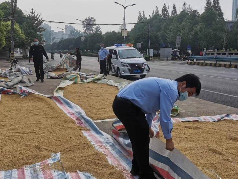 执法人员秉持着“教育为先、劝导为主、文明执法”原则,对沿街晾晒点拍照取证,找到晾晒稻谷的村民,告知其沿街占道晾晒行为违反了《湖北省城市市容市貌和环境卫生管理条例》第二章第十一条相关规定。村民表示“在马路上晾晒,粮食干得快,我们没有其他地方可以晾晒。”