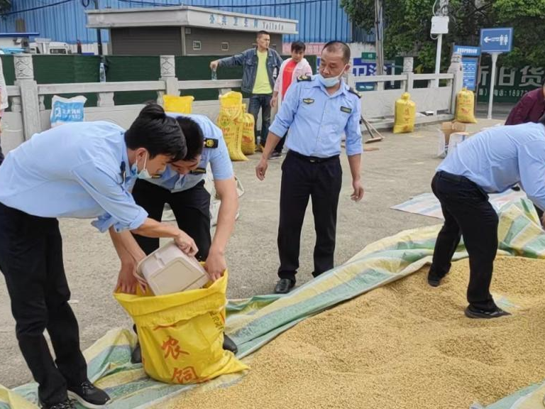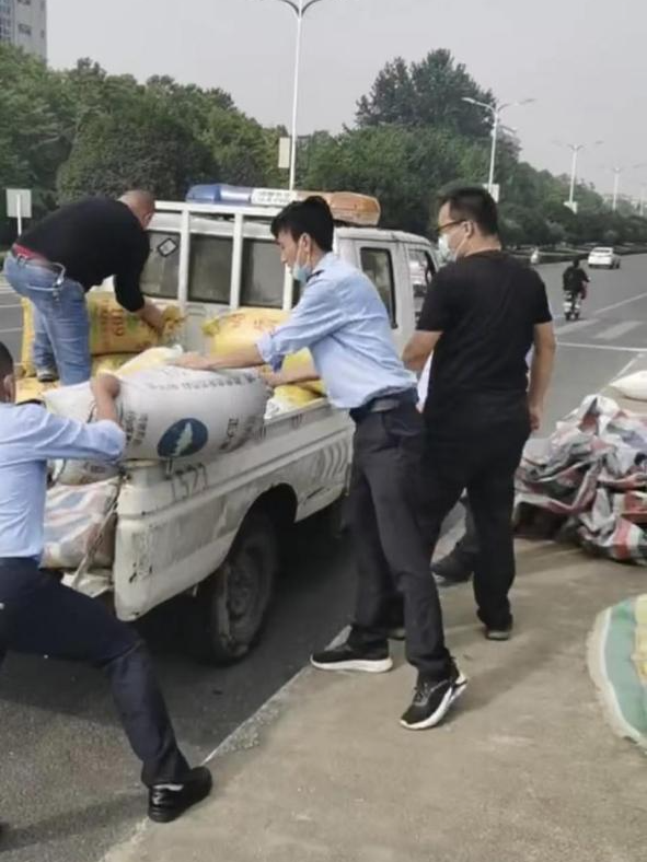十余名执法人员从附近居民家里借来工具,共同协助村民清收稻谷,经过半个小时共同努力,四千余斤谷子全部装进一个个蛇皮袋,扎紧袋口,然后装车转运,全程文明执法,赢得群众一致好评。