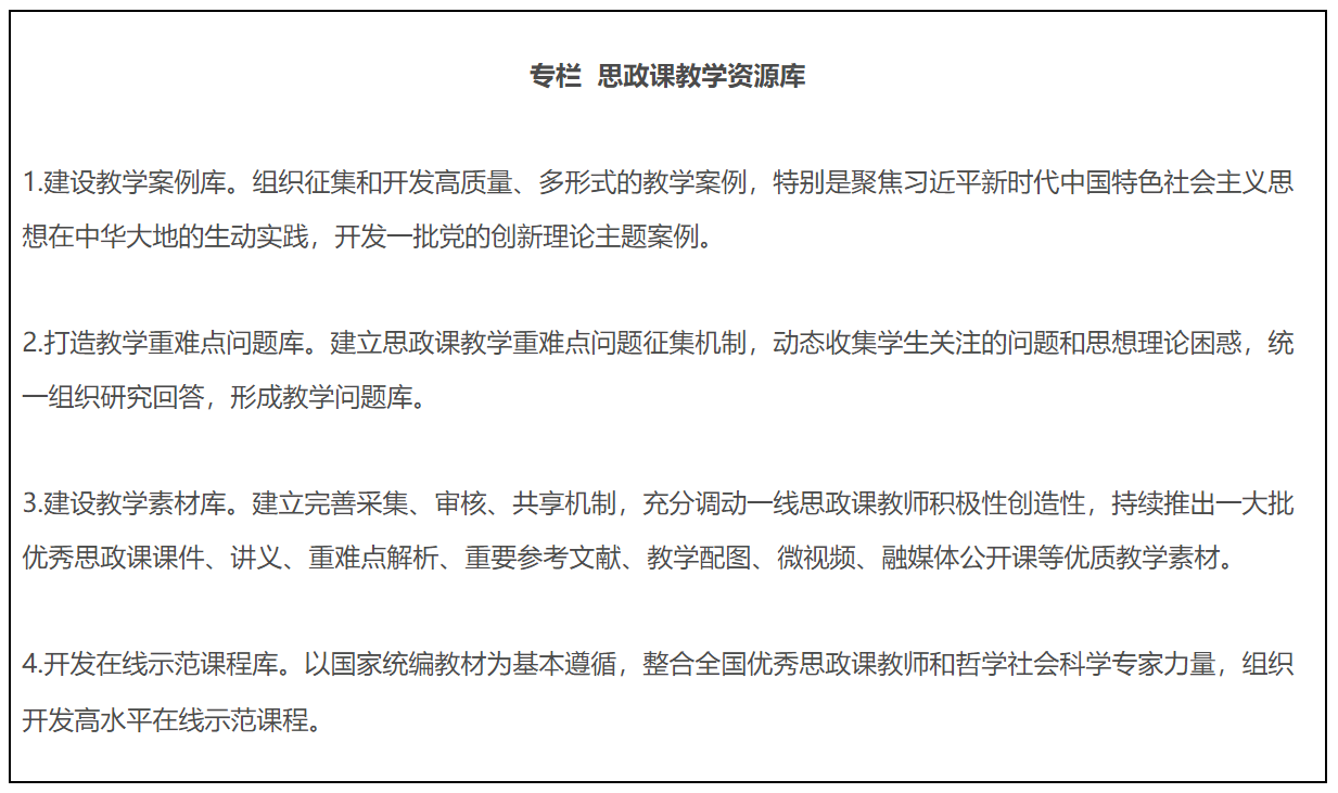 12.推进国家智慧教育平台建设使用。教育部把“大思政课”摆在教育信息化的突出位置,加强国家智慧教育平台思政教育资源建设。通过项目支持的方式,推动教学资源建设常态化机制化。组织开发和推荐一批科学权威实用的课件、讲义,推动一线教师统一使用。加强思政课教学资源库建设,实施中小学思政课精品课程建设计划,推出一批思政“金课”。加大优质资源推广使用力度,指导各地各校用好国家智慧教育平台。