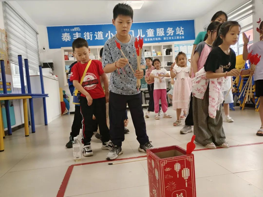 志愿者向学生介绍投壶游戏的起源和玩法,示范投壶的正确姿势和方法,有效锻炼了孩子们手眼协调、团队协作与反应能力。