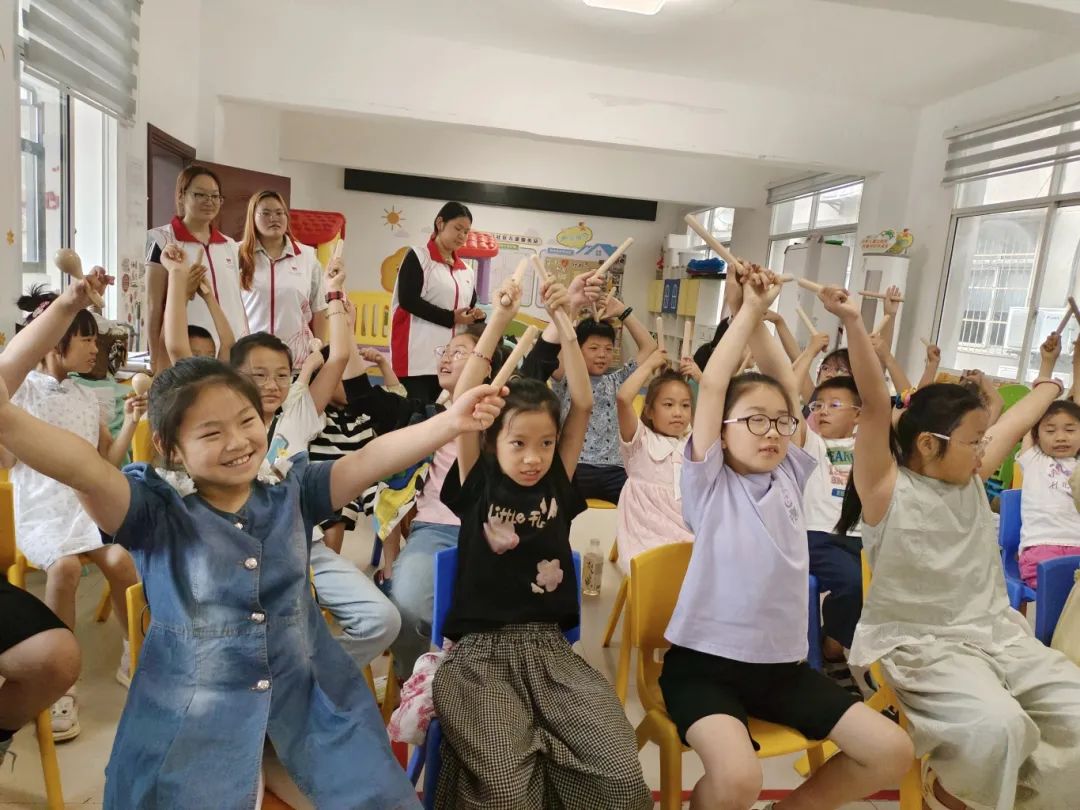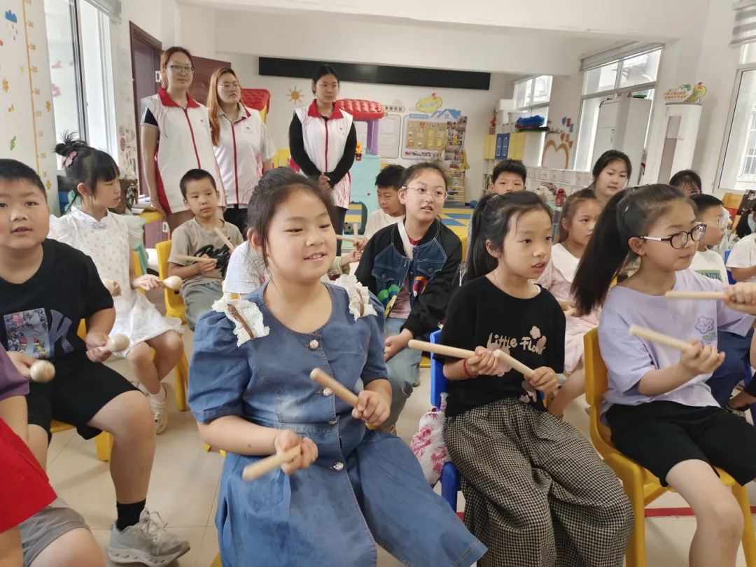 随着欢快的音乐响起,儿童服务站的孩子们一起欢唱《端午歌曲》,每人手中握着的节奏棒。随着轻快的儿歌响起,双手手腕灵活抖动,“哒哒哒”地敲击出稳定的节拍,亮晶晶的眼睛满是专注。