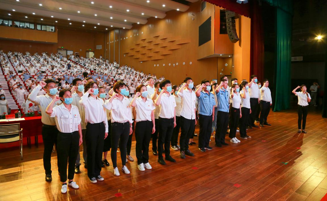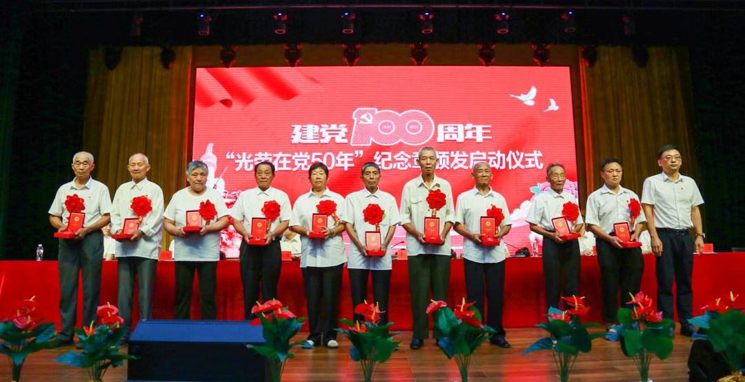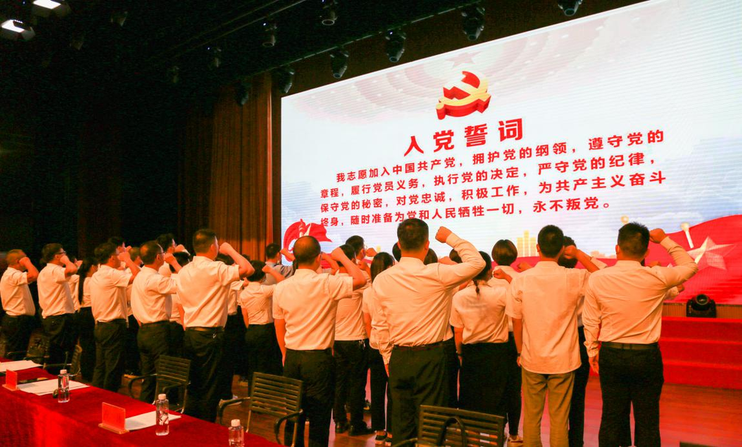 会议还为老党员颁发“光荣在党50年”纪念章,宣读了2021年预备党员转正及预备党员名单,党委委员孙桦同志上前领誓,纳新和转正党员上前宣誓,全体党员起立重温入党誓词。
