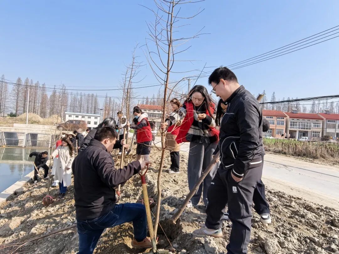 活动现场,关户村天宝河畔的植树区域早已划分就绪,阳光洒下,波光粼粼的河水与崭新的植树点位相映成趣。机关干部们精神饱满、分工协作,在技术人员的指导下,严格按照池杉树种植要求开展作业。大家三人成组、五人一队,有的挥锹铲土,深挖树坑;有的扶稳树苗,确保根系舒展、植株挺拔;有的培土压实,让泥土紧密包裹根系;还有的提水浇灌,为新苗送上第一份滋养。