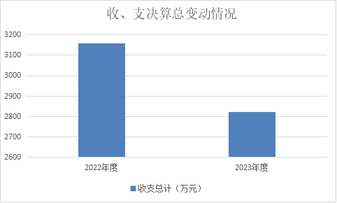 2023年度收、支总计均为2820.02万元。与2022年度相比,收、支总计减少338.70万元,降低10.7%,主要原因是按需缩减预算开支项目,积极响应市政府过紧日子的要求。