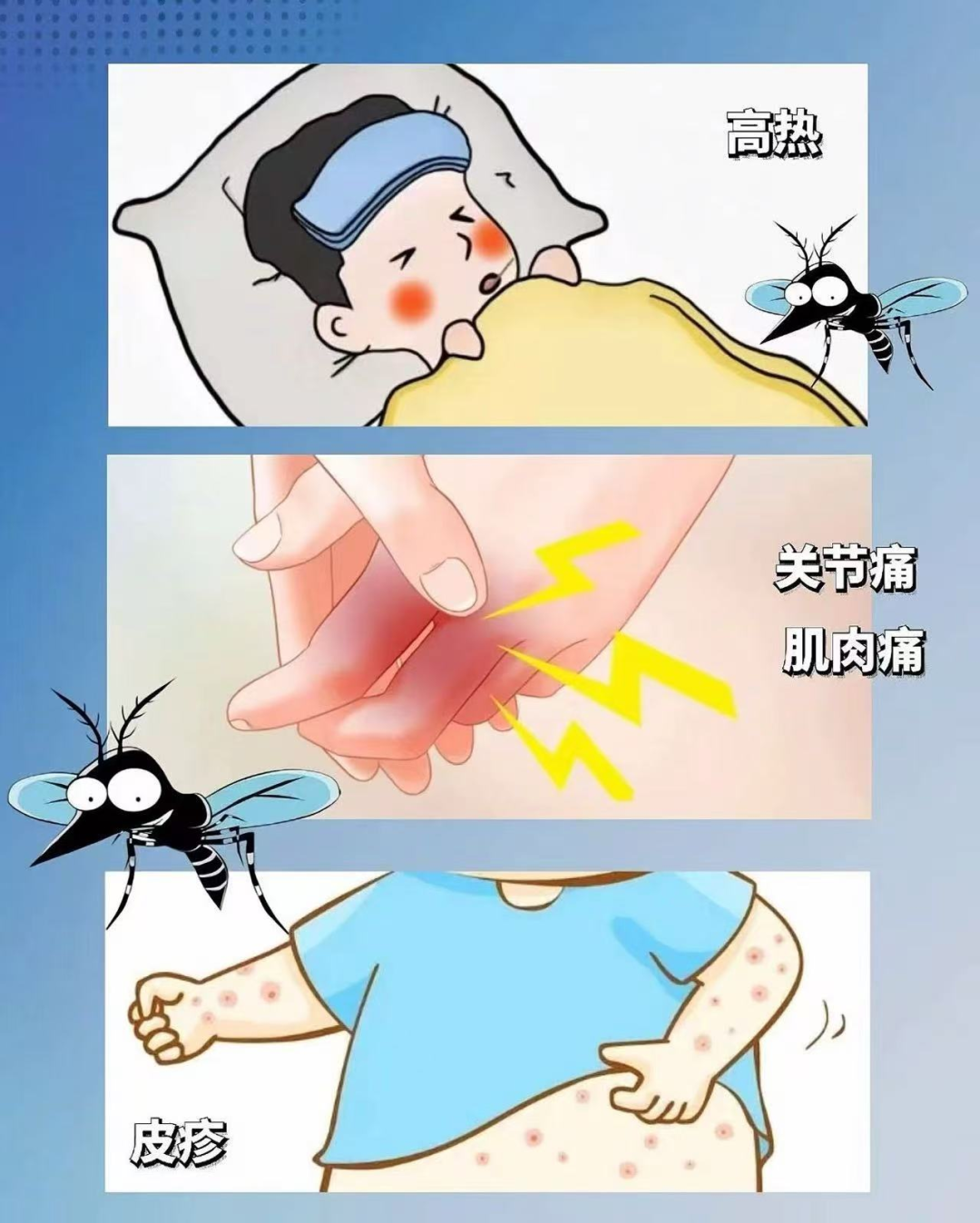 如您出现发热、关节痛、皮疹等症状,请立即就医,切记:避免自行服用阿司匹林、布洛芬等非甾体类抗炎药!如果您的小区或周边出现登革热、基孔肯雅热病例,请积极配合开展相关处置工作。