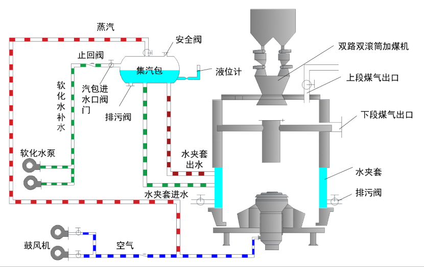 带水夹套的煤气发生炉主要由加煤机、煤气出口、炉体、蒸汽集汽包、水夹套、软化水补水系统、安全附件等组成。集汽包配套设有液位计、安全阀、排污阀等。