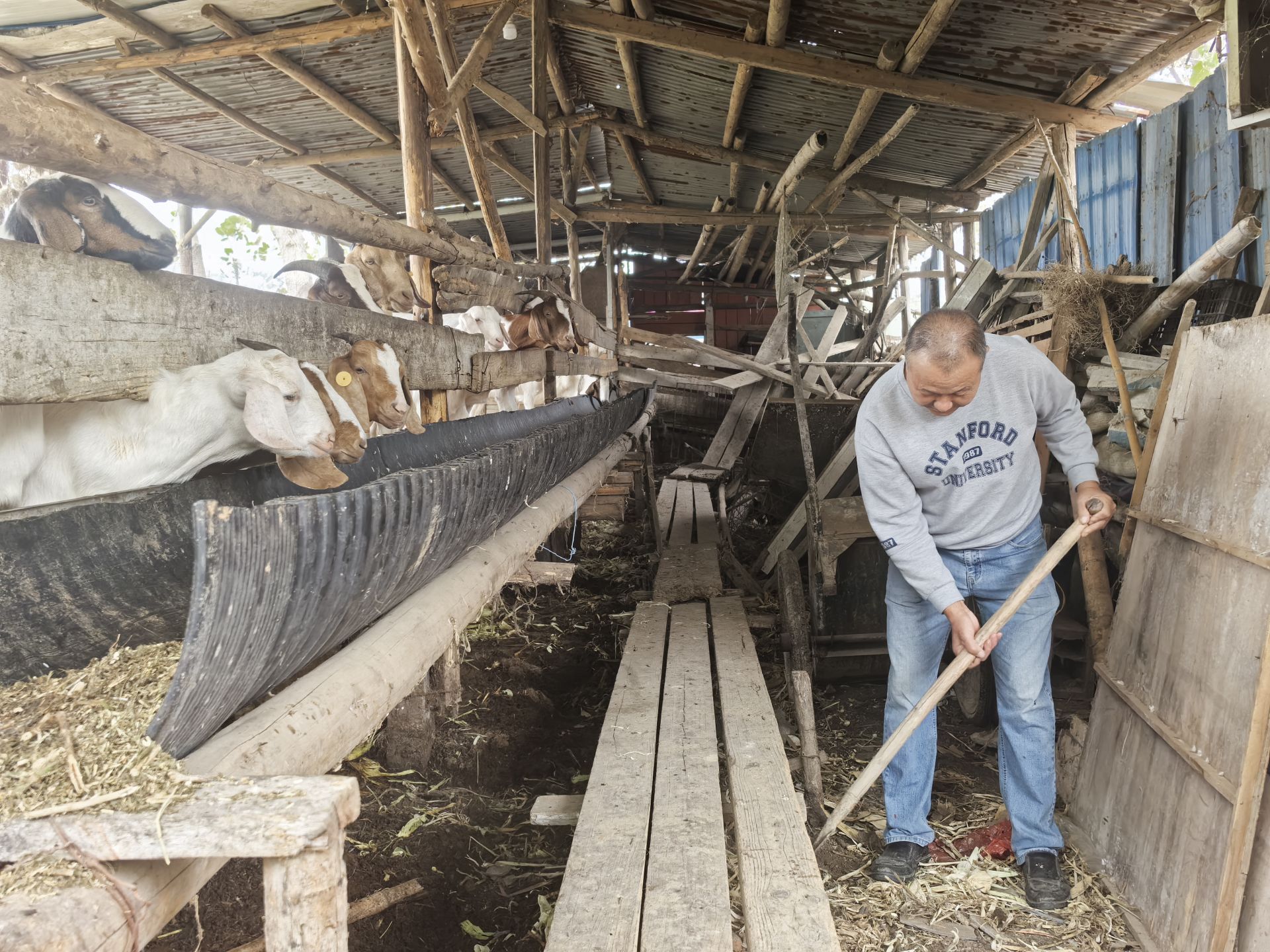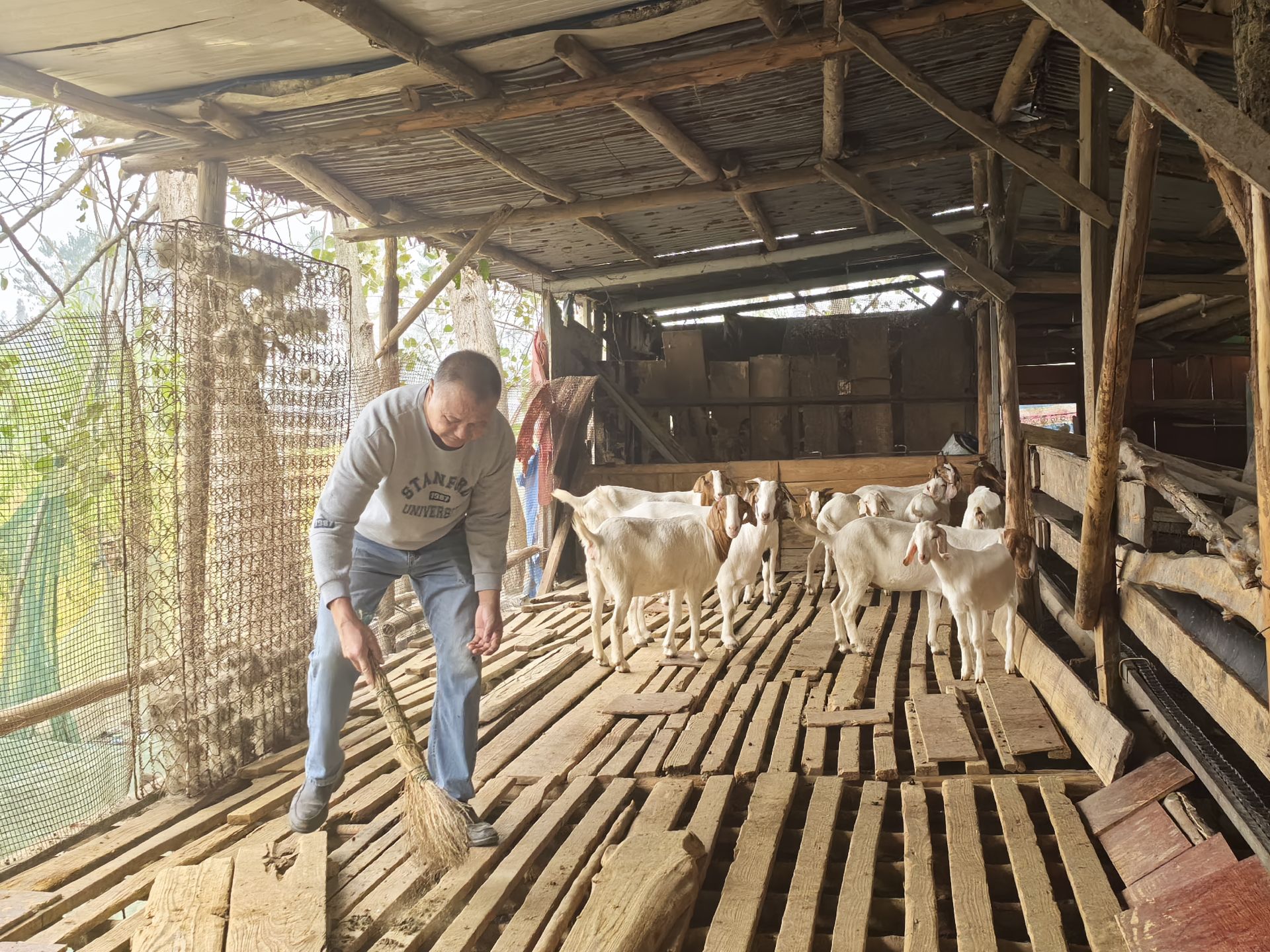 走进羊舍,只见小羊们在悠闲地“散步”,偶尔还会“咩咩”地叫几声,龚义兵正忙着为小羊打扫羊舍、喂养饲料。