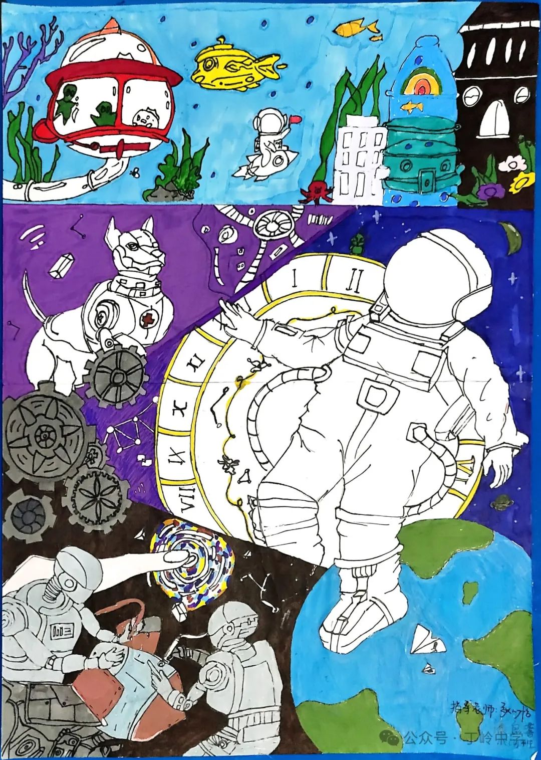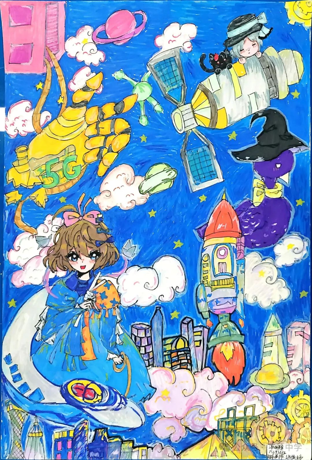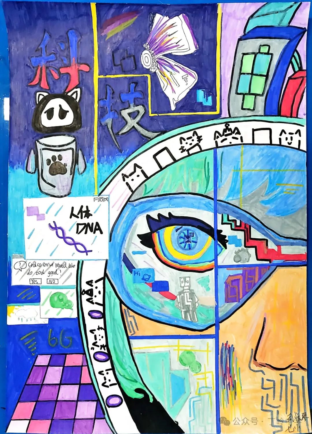 同学们化身 “未来设计师”,以笔为桨、以梦为帆,在画布上展开奇幻遨游 —— 有人用荧光笔触勾勒星际移民的生态城邦,有人以细腻线条编织人工智能与自然共生的美好图景,更有人将各种前沿概念转化为可视化的艺术语言。每一幅作品都是思维火花的具象化呈现,既承载着对现有科技的深度思考,更流淌着对未来世界的大胆构想,科技的冷峻与艺术的温暖此刻在画纸上达成奇妙共振!
